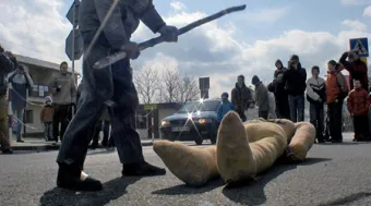 Der österreichische Fotograf und Filmemacher Andreas Horvath filmt jene Szenen in ebenso ambivalenten Einstellungen. Zu Beginn verschwörerisch vertraut mit den Puppenbauern, sodann mal voyeuristisch nah am Geschehen, mal mit kritischem Abstand zur Menschenschar oder fragend auf Kinderhänden und Schlagstöcken verweilend, springt die Kamera in ihren Ansichten hin und her und setzt derart einen irritierenden Kontrast zur eindeutigen Wertvorstellung vor Ort (Andrea Wildt).